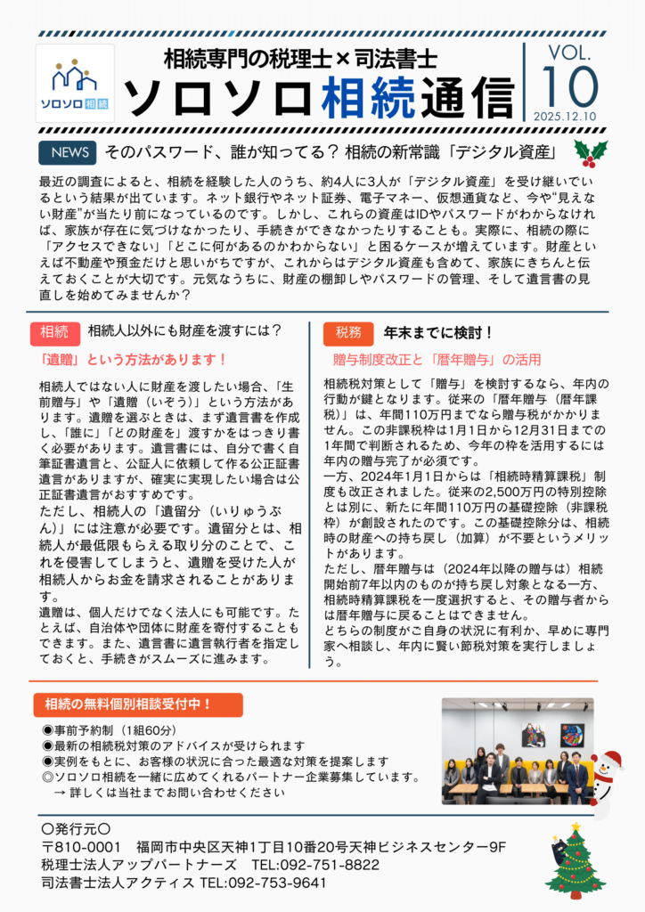 税理士法人アップパートナーズ資産税部では、「ソロソロ相続通信 vol.10」を発行いたしました。 ぜひご覧ください!